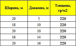 Ширина 10,4, 15,6 та 18 м Довжина 25 м Товщина 140 гр/м2