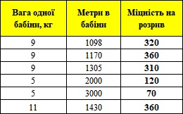 Ширина 1,23 та 1,25 м Довжина 3000 м Міцність на розрив 260, 270, 290, 300 кг